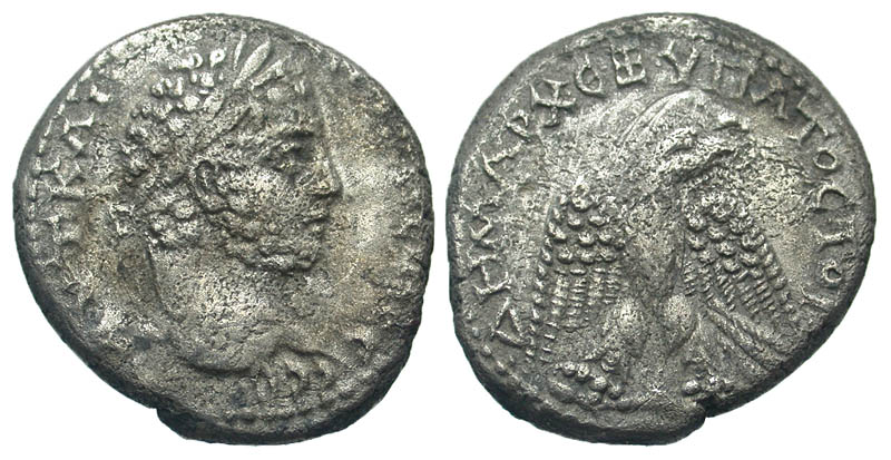 Syria, Seleucis and Pieria. Antiochia ad Orontem. Caracalla. A.D. 198-217. BI tetradrachm (26.7 mm, 13.79 g, 11 h). RY 2 = 211-212. AYTKAI ANTΩNEINOC CE B, laureate, draped, and cuirassed bust right / ΔHMAPX EΞ VΠATOCTOYΓ, eagle standing right, holding wreath in beak, with wings spread. Prieur 214; Bellinger 11. aVF.