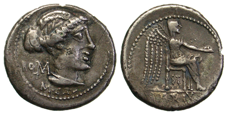 M. Porcius Cato. 89 B.C. AR denarius (18.8 mm, 3.10 g, 9 h). Rome. ROMA / M·CATO, diademed and draped female bust right / VICTRIX, Victory seated right, holding palm-branch and patera; ST below chair. Crawford 343/1b ; Sydenham 596; RSC Porcia 5. VF, toned, scratch on obverse.