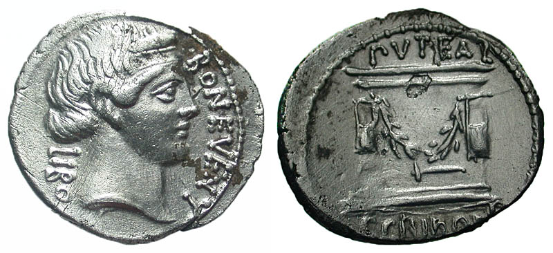 L. Scribonius Libo. 62 B.C. AR denarius (20.8 mm, 3.93 g, 5 h). Rome mint. LIBO BON EVENT, diademed head of Bonus Eventus right / PVTEAL SCRIBON, wellhead decorated with garland and two lyres; hammer at base. Crawford 416/1a; Sydenham 928; RSC Scribonia 8a. gVF, slight bend.