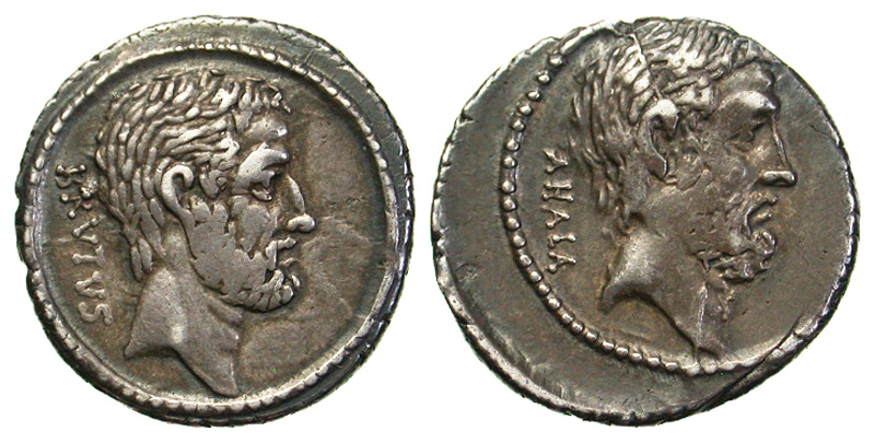 M. Junius Brutus (Q. Servilius Caepio Brutus). 54 B.C. AR denarius (19.7 mm, 3.95 g, 4 h). Rome. BRVTVS, bare-headed and bearded head of L. Junius Brutus right / AHALA, bare-headed and bearded head of Caius Servilius Ahala right. Crawford 433/2; Sydenham 907; RSC Junia 30. toned gVF.