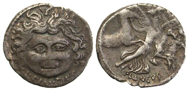 L. Plautius Plancus. 47 B.C. AR denarius (19.2 mm, 3.51 g, 5 h). Rome. L • PLAVTIVS, facing mask of Medusa with disheveled hair, coiled serpents at either side of face / PLANCVS, Aurora, draped and winged, flying right, head facing slightly left, holding reins in each hand, conducting four rearing horses of the sun. Crawford 453/1a; Sydenham 959; CRI 29; RSC Plautia 15. Fine, toned.