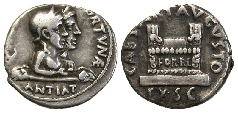 Augustus. 27 B.C.-A.D. 14 AR denarius (19.1 mm, 3.86 g, 1 h). Rome, 19-18 B.C. Q. Rustius, moneyer. Q RVSTIVS FORTVAE, ANTIAT, jugate and draped busts right of Fortuna Victrix, wearing round helmet, holding patera, and of Fortuna Felix, wearing stephane, set on bar with ram’s head finials / CAESARI AV GVSTO, EX • S • C, ornamented rectangular altar inscribed FOR RE, set on base. RIC 322; BMCRE 2-4; RSC 513. toned VF, Rare.