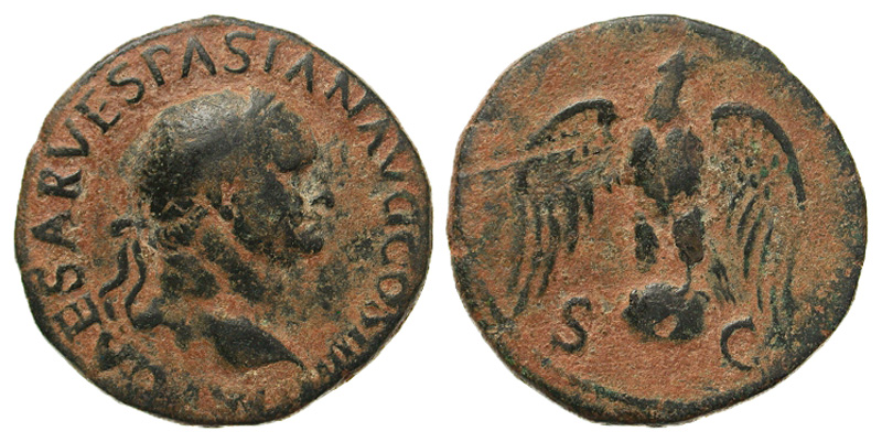 Vespasian. A.D. 69-79. Æ as (28.7 mm, 12.98 g, 6 h). Lyons, A.D. 72. IMP CAESAR VESPASIAN AVG COS IIII, laureate head right, globe at point of bust / / S-C, eagle standing facing on globe, head right, wings spread . RIC 1202; BMCRE 822. VF, red patina.