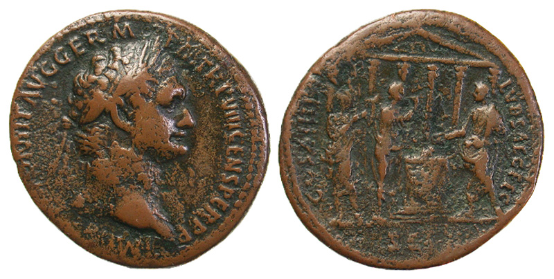 An interesting and important historical type, commemorating the Secular Games celebrated by Domitian in October of 88 AD. The reverse sacrificial scene shows the togate emperor standing left, holding patera and sacrificing over garlanded altar, with harpist and double-flute player to left, all before hexastyle Temple of Jupiter Capitolinus in the background.