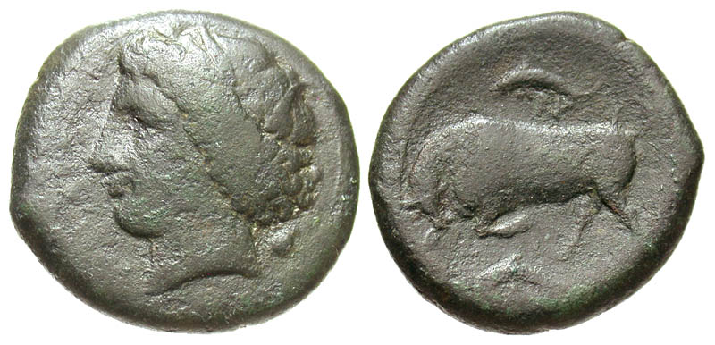 Sicily, Syracuse. Hieron II. 275-215 B.C. Æ 22 (22 mm, 9.97 g, 2 h). Head of Persephone left, wreathed with grain, aryballos behind / Bull butting left, dolphin and NK monogram above, dolphin below. SNG ANS 568; SNG Munchen 1213; Calciati 96. VF, glossy green patina.