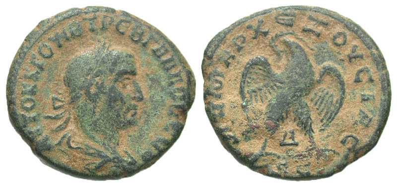 Syria, Seleucis and Pieria. Antiochia ad Orontem. Trebonianus Gallus. A.D. 251-253. BI tetradrachm (26.7 mm, 12.00 g, 11 h). A.D. 251. AVTOK K Γ OYIB TPEB ΓAΛΛOC CEB, laureate, draped, and cuirassed bust right, four pellets below neck / ΔHMAPX EΞOVCIAC, SC, eagle standing left, head left, holding wreath in beak, with wings spread; Δ between eagle's legs. Prieur 662; McAlee 1172d. aVF, red patina.