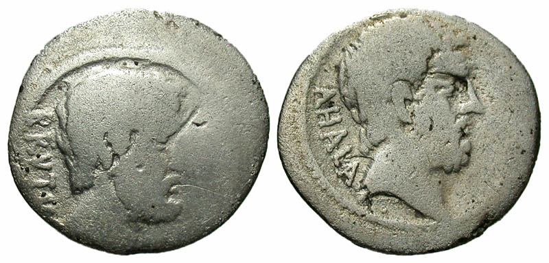 M. Junius Brutus (Q. Servilius Caepio Brutus). 54 B.C. AR denarius (19.8 mm, 3.02 g, 7 h). Rome mint. BRVTVS, bare-headed and bearded head of L. Junius Brutus right / AHALA, bare-headed and bearded head of Caius Servilius Ahala right. Crawford 433/2; Sydenham 907; RSC Junia 30. a Fine.