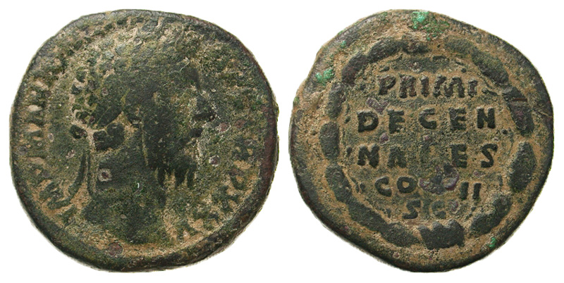 Marcus Aurelius. A.D. 161-180. Æ sestertius (31.3 mm, 28.93 g, 11 h). Rome, A.D. 170. IMP M ANTONINVS AVG TR P XXV, laureate head right / PRIMI-DECEN-NALES-COS III-S C, in five lines within laurel wreath. RIC 1006; BMCRE 1398. aVF, sandy patina.