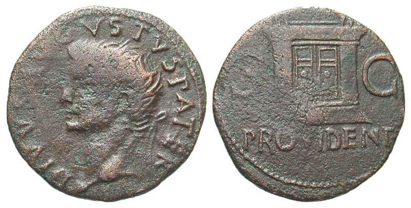 Divus Augustus. Died A.D. 14. Æ as (27.5 mm, 7.72 g, 3 h). Rome mint, ca. A.D. 22-30. DIVVS AVGVSTVS PATER, radiate head left / PROVIDENT S C, ornamented altar with double doors. RIC 81 (Tiberius); BMCRE 146 (Tiberius). Fine.