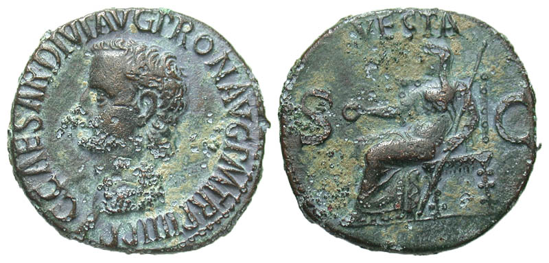 Gaius Caligula. A.D. 37-41. Æ as (29.2 mm, 9.56 g, 5 h). Rome mint, A.D. 40-41. C CAESAR DIVI AVG PRON AVG P M TR P IIII P P, bare head left / VESTA, S-C, Vesta seated left, holding patera and scepter. RIC 54; BMCRE 72. Fine, black patina with blue highlights.