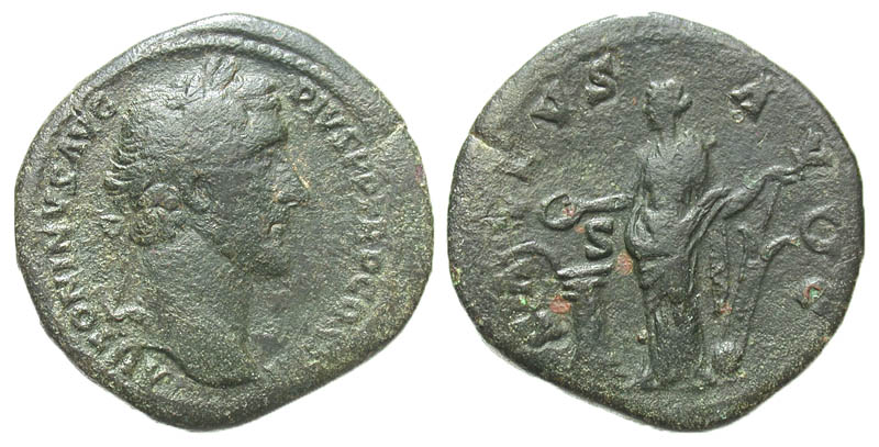 Antoninus Pius. A.D. 138-161. Æ sestertius (33.5 mm, 26.99 g, 11 h). Rome mint, struck A.D. 145-147. ANTONINVS AVG PIVS P P TR P COS III, radiate head right / SALVS AVG, S-C, Salus standing left, holding patera and rudder on a globe, feeding serpent rising from altar. RIC 784; BMCRE 1715. Fine.