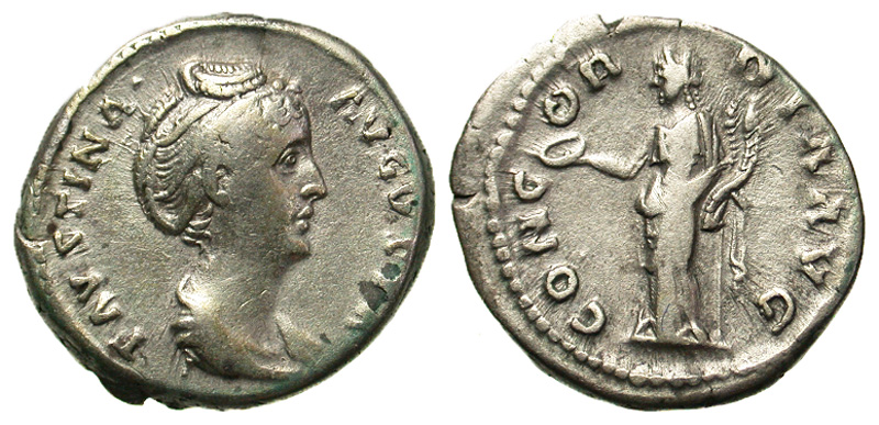 Faustina I. Augusta, A.D. 138-140/1. AR denarius (19.0 mm, 3.62 g, 5 h). Rome, A.D. 139-141. FAVSTINA AVGVSTA, draped bust right / CONCORDIA AVG, Concordia standing left, holding patera and double cornucopia . RIC 335; RSC 151. VF.