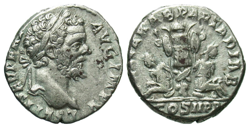 Septimius Severus. A.D. 193-211. AR denarius (17.5 mm, 3.59 g, 12 h). Rome mint, A.D. 195. L SEPT SEV PERT AVG IMP V, laureate head right / PART ARAB ADIAB, COS II PP, trophy between two captives, seated on shields, hands bound behind them. RIC 63; RSC 365; BMCRE 120. aVF.