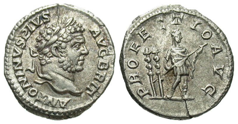 Caracalla. A.D. 198-217. AR denarius (18.8 mm, 3.62 g, 6 h). Rome mint, A.D. 210-213. ANTONINVS PIVS AVG BRIT, laureate head right / PROFECTIO AVG, Caracalla standing right, holding spear; two standards behind him. RIC 225; BMCRE 97; RSC 509. VF, small flan crack.