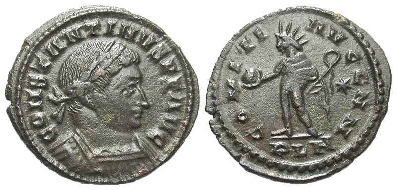 Constantine I. A.D. 307/10-337. Æ Follis (24.2 mm, 5.00 g, 6 h). London mint, struck A.D. 310-312. Rare. CONSTANTINVS P F AVG, laureate and cuirassed bust right / COMITI AVGG NN, Sol standing left, holding globe and whip; star field, PLN in exergue. RIC 153. EF.