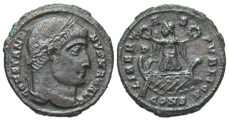 Constantine I. A.D. 307/10-337. Æ Follis (19.9 mm, 3.21 g, 12 h). Constantinople mint, struck A.D. 327. Scarce. CONSTANTINVS MAX AVG, laureate head right / LIBERTAS PVBLICA, Victory standing left on galley, wreath in both hands; B left, CONS in exergue. RIC 18. aVF.