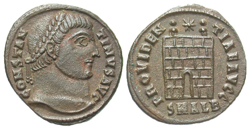 Constantine I. A.D. 307/10-337. Æ 3 (19.4 mm, 2.95 g, 5 h). Alexandria mint, A.D. 325-326. CONSTANTINVS AVG, laureate head right / PROVIDENTIA AVGG, camp gate with two turrets, star above; SMALB in exergue. RIC 34; LRBC 1402. VF.