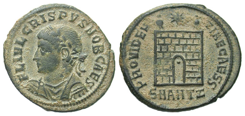 Crispus. Caesar, A.D. 317-326. Æ 3 (20.5 mm, 3.08 g, 5 h). Antioch mint, A.D. 326-327. FL IVL CRISPVS NOB CAES, laureate and cuirassed bust left / PROVIDENTIAE CAESS, camp gate with two turrets, one star above, pellet in doorway; SMANTZ in exergue. RIC 72; LRBC 1322. VF, sandy patina.