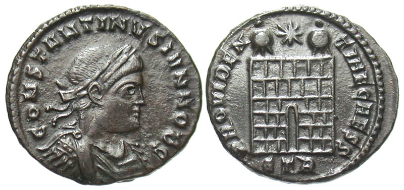 Constantine II. As Caesar, A.D. 317-337. Æ 3 (18.8 mm, 2.68 g, 5 h). Trier mint, A.D. 324-325. CONSTANTINVS IVN NOB C, laureate, draped and cuirassed bust right / PROVIDENTIA CAESS, camp gate with two turrets, star above; STR in exergue. RIC 464; LRBC -. gVF, black patina.