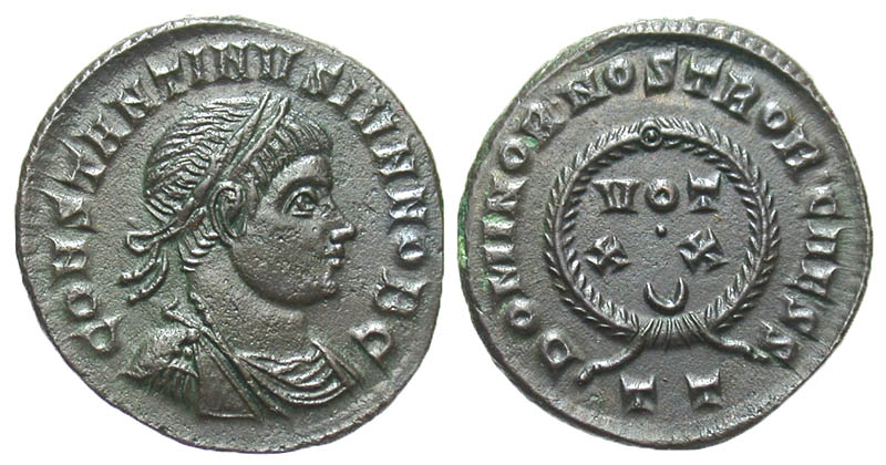 Constantine II. As Caesar, A.D. 317-337. Æ 3 (19.5 mm, 3.31 g, 6 h). Ticinum mint, struck A.D. 325. Rare. CONSTANTINVS IVN NOB C, laureate, draped and cuirassed bust right / DOMINOR · NOSTROR · CAESS, legend around VOT/XX/crescent; TT in exergue. RIC 176; LRBC 493. EF, black patina.