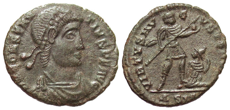 Constantius II. A.D. 337-361. Æ 3 (18.4 mm, 2.11 g, 7 h). Siscia mint, A.D. 350. Scarce. D N CONSTANTIVS P F AVG, laureate, draped and cuirassed bust left / VIRTVS AVGVSTORVM, Emperor standing right holding transverse spear and globe, treading on captive to right; ASIS in exergue. RIC 295; LRBC 1181. gVF.