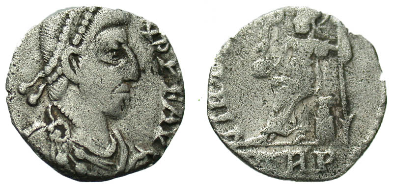 Arcadius. A.D. 383-408. AR siliqua (13.6 mm, 1.09 g, 5 h). Trier mint, A.D. 392-395. DN ARCADIVS PF AVG, pearl-diademed, draped, and cuirassed bust right / VIRTVS ROMANORVM, Roma seated left, holding Victory on a globe and spear; TRPS in exergue. RIC 106b; LRBC 27e. VF, clipped.