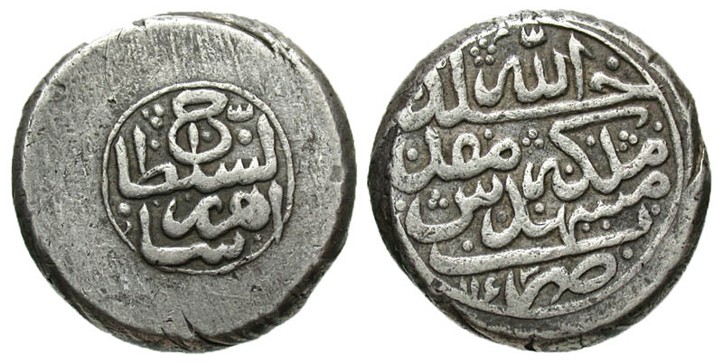 Afsharid. Shahrukh. 1st reign, 1161-1163/1748-1750. AR double rupi (26.2 mm, 23.21 g, 4 h). Type C. Mashhad mint, 1163 A.H. Album 2773. VF.