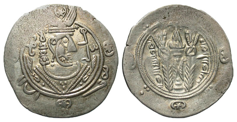 Tabaristan, Abbasid Governors. Hani. 788-790. AR hemidrachm (22.4 mm, 1.97 g, 2 h). Crowned Sasanian-style bust right / Fire altar flanked by attendants; star and crescent flanking flames. Malek 114; Album 69. gVF.