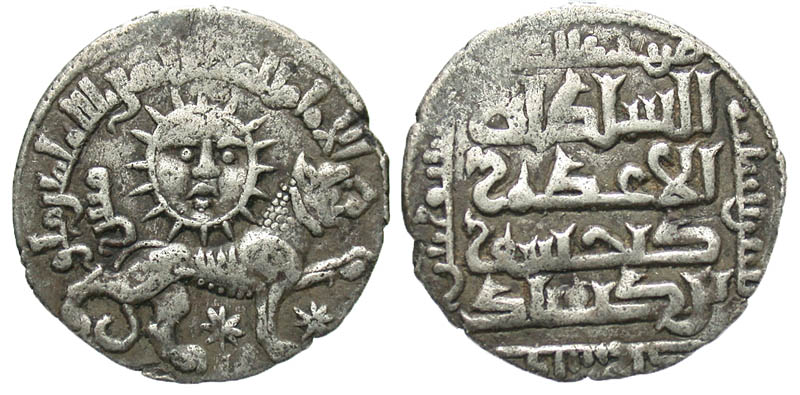 Seljuqs of Rum. Kaykhusraw II Ghiyath al-Din. 634-644/1236-1245. AR dirham (21.7 mm, 2.89 g, 1 h). Siwas mint, A.H. 641. Lion advancing right, three stars around; above, personification of sun / Name and title of Kay Khusrau; mint and date in outer margins. Album 1218. toned aVF.