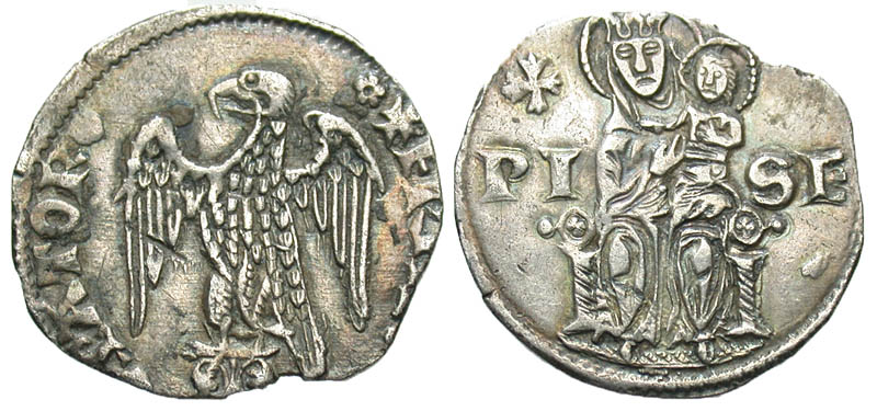 Italian States, Pisa. Republic. 1296-1312. AR grosso da 2 soldi (19.7 mm, 1.86 g, 5 h). FEDERIC IHPATER, eagle standing left / PI /SE, Madonna seated facing, holding nimbate Christ. MIR 410 vv; CNI 25-30. gVF.