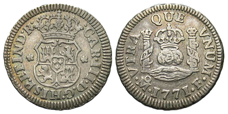 Mexico, Colonial. Carlos III. 1760-1788. AR 1/2 real (16.9 mm, 1.67 g, 12 h). Mexico City mint, 1771. CAR·IIII·D·G·HISP·ET IND·R·, crowned arms, rose on either side / VTRA QUE VNUM· o/M 1771·F·, crowned globes flanked by crowned and bannered pillars, over water. KM 68; Calico 1675.