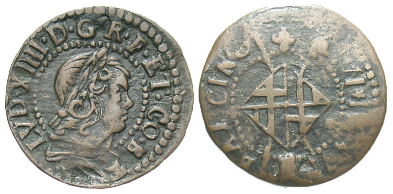 Lot 20-214. Spain, Catalonia-Aragon. Louis XIV, King of France. 1643-1715. Æ seiseno. Barcelona mint, 1647.