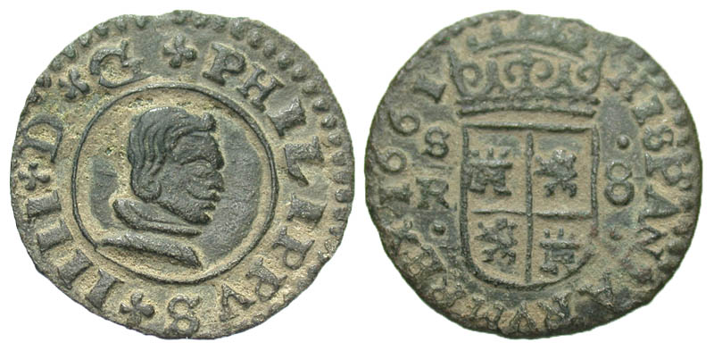 Spain, Castille y Leon. Philip IV. 1621-1665. BI 8 maravedis (20.0 mm, 1.80 g, 12 h). Segovia mint, 1661. PHILIPPVS * IIII * D* G*, bare-headed, bust right / HISPANIARVM REX 1661, crowned arms of Castille and Leon. KM 162. VF, sandy patina.