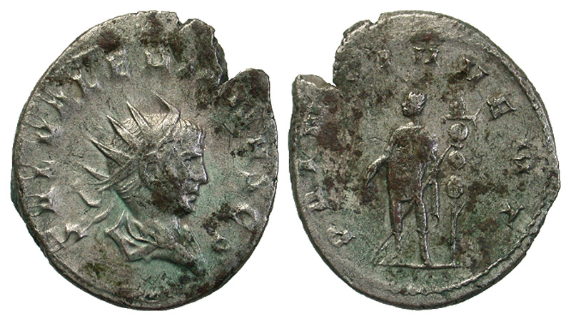 Saloninus. As Caesar, A.D. 255-259. BI antoninianus (23.8 mm, 3.58 g, 0 h). Viminacium, A.D. 256. SAL VALERIANVS CS, radiate and draped bust right / PRINC IVVENT, prince standing left, holding baton and scepter, scepter to right. RIC 10. VF, black and green toning.