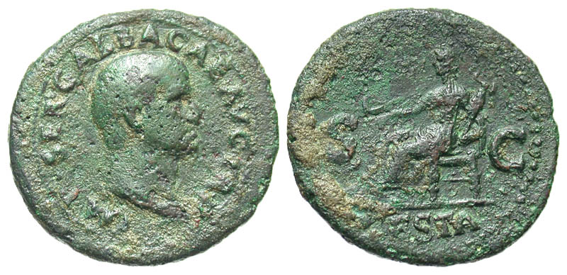 Galba. A.D. 68-69. Æ as (31.1 mm, 12.47 g, 5 h). Rome mint, Struck A.D. 68. Rare. IMP SER GALBA CAES AVG TR P, bare head right / SC, VESTA, Vesta seated left, holding patera and palladium. RIC 306; BMCRE 157. Fine, pitted.