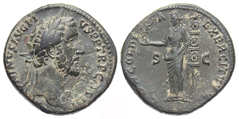Antoninus Pius. A.D. 138-161. Æ sestertius (32.3 mm, 25.70 g, 12 h). Rome mint, Struck A.D. 141-143. Scarce. ANTONINVS AVG PIVS PP TR P COS III, laureate head right / CONCORDIA EXERCITVM, SC, Concordia standing left, holding Victory and legionary standard. RIC 600; BMCRE 1233. gVF, sandy highlights.