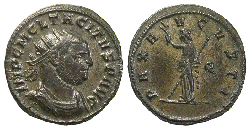 Tacitus. A.D. 275-276. Æ antoninianus (22.6 mm, 3.62 g, 12 h). Treveri. IMP CM CL TACITVS P AVG, radiate and cuirassed bust right / PAX AVGVSTI, Pax standing left, holding branch and transverse scepter; Q in right field. Estiot 2228; La Venera 1806; RIC -. gVF, silvered.