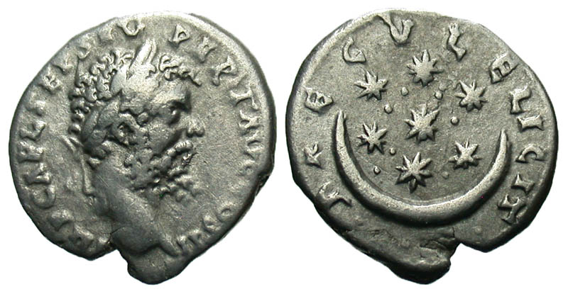 Septimius Severus. A.D. 193-211. AR denarius (17.3 mm, 2.51 g, 6 h). Emesa mint, Struck A.D. 194-195. Rare variety. IMP CAE L SEP SEV PERT AVG COS II, laureate head right / SAECVL ELICIT (sic), crescent moon with seven stars and pellets. cf RIC 417; cf BMCRE W390; cf RSC 628a. VF.