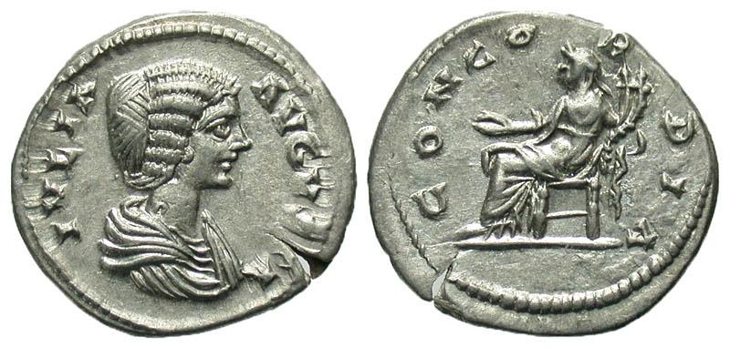 Julia Domna. Augusta, A.D. 193-217. AR denarius (20.1 mm, 3.46 g, 1 h). Laodicea ad Mar mint, Struck A.D. 198-202. IVLIA AVGVSTA, draped bust right / CONCORDIA, Corncordia seated left, holding patera and cornucopia. RIC 637; RSC 21. VF.