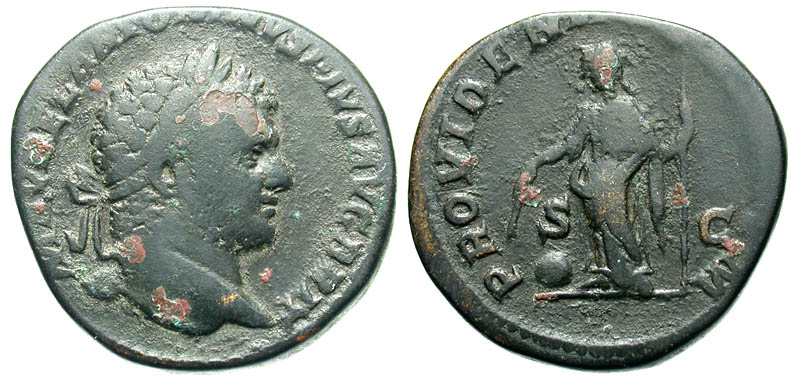 Caracalla. A.D. 198-217. Æ sestertius (30.5 mm, 21.0 g, 12 h). Rome mint, Struck A.D. 213. M AVREL ANTONINVS PIVS AVG BRIT, laureate head right / PROVIDENTIAE DEORVM, S-C, Providentia standing left, holding wand over globe, and long scepter. RIC 511a; BMCRE 242. aVF.