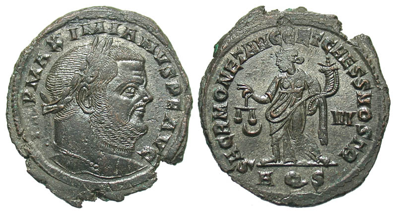 Maximianus. First reign, A.D. 286-305. Æ Follis (29.8 mm, 9.82 g, 7 h). Aquileia mint, Struck A.D. 304-305. IMP MAXIMIANVS P F AVG, laureate head right / SACRA MONETA AVGG ET CAESS NOSTR, Moneta standing left, holding scales and cornucopia, crescent-VI in fields, AQS in exergue. RIC 39b. VF.