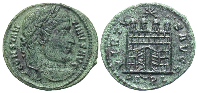 Constantine I. A.D. 307/10-337. Æ 3 (20.5 mm, 2.66 g, 7 h). Arles mint, Struck A.D. 325-326. CONSTANTINVS PF AVG, laureate, draped, and cuirassed bust left / VIRTVS AVGG, campgate with four turrets, one star above, with open doors; PA crescent RL in exergue. RIC 291; LRBC 291. VF, green patina.