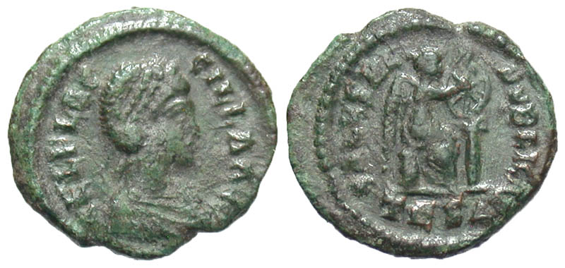 Aelia Flaccilla. Augusta, A.D. 379-386/8. Æ 4 (15.2 mm, 1.56 g, 6 h). Thessalonica mint, Struck A.D. 378-383. Scarce. AEL FLACCILLA AVG, pearl-diademed and draped bust right / SALVS REIPVBLICAE, Victory seated right, inscribing Chi-Rho onto shield set on column, TESA in exergue. RIC 47; LRBC 1847. VF.