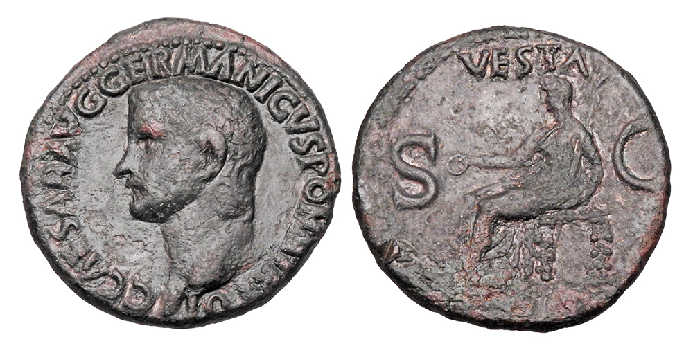 CALIGULA, 37-41 AD. AE As (11.67 gm). Bare head / Vesta veiled seated holding patera and sceptre. RIC.38. VF+, dark brown patina, some smoothing in fields..