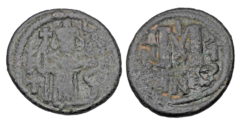 ARAB-BYZANTINE. 635-670 AD. AE Fals (5.96 gm), Standing Emperor type, of ?pseudo Damascus? mint. Crowned draped bust / Large M. SIC.Ash.578/577v. VF, black patina. Rare. Based on Damascus fals, SIC.Ash.560-3.