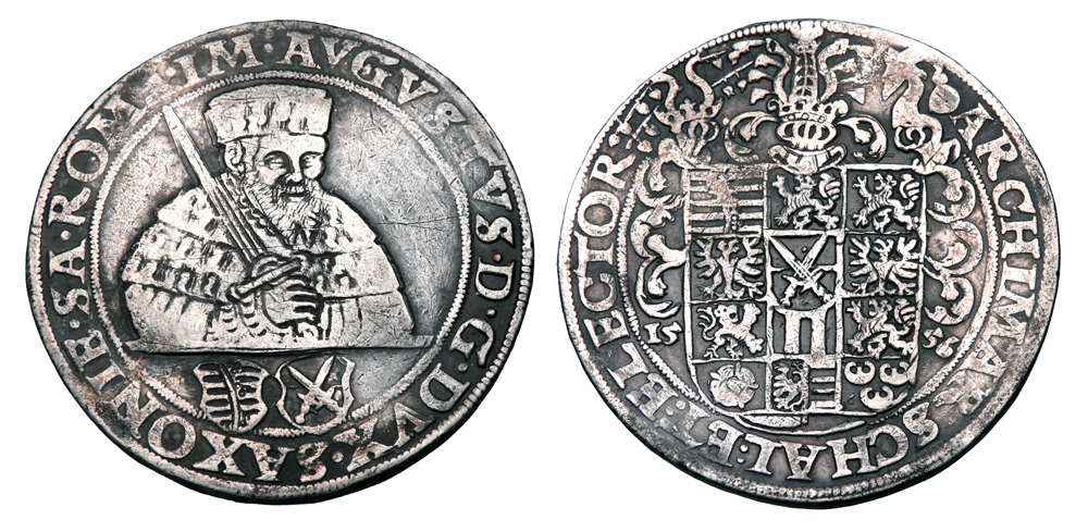 GERMANY, Saxony. August, 1553-1586 AD. AR Taler (28.91 gm) of Dresden, 1556. 3/4 facing bust wearing robes and hat, holding sword, two shields of arms below / Three helmets on shield of arms. Dav.9794. Toned VF.