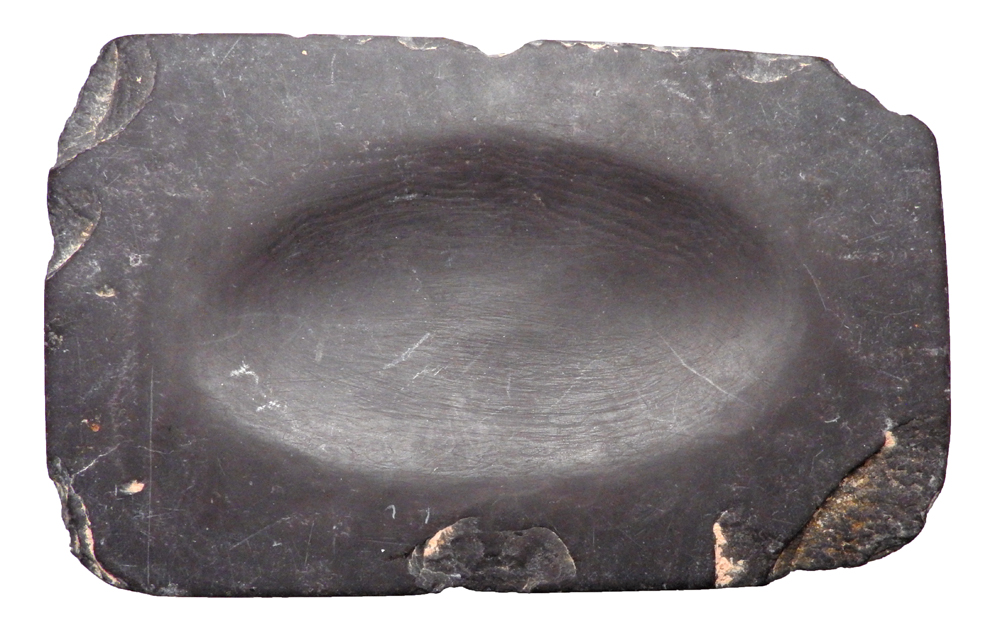 Slate Cosmetic Grinding Palate. Near East, IV-II Millennium BC. Black slate slab with central depression, used for grinding small amounts of cosmetic powders. 4.25? x 3.75? rectangle. Some edge chipping, otherwise intact.