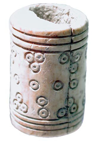Bone Chess Piece - Queen. England, XIII-XIV Century. Bone cyclinder which originally held an inserted head. Decorated with incised ring and dot motifs. Similar to Museum of London specimen (MedHous.956) except it is lacking the ?mahout? wedge which desinates their peice as a King -- presumably this peice is a Queen. 1.5? tall. Stable scrach to side, else intact (minus inserted head). Very rare -- possibly the first recorded Queen of this design. An extremely rare opportunity for the Chess enthusiast.