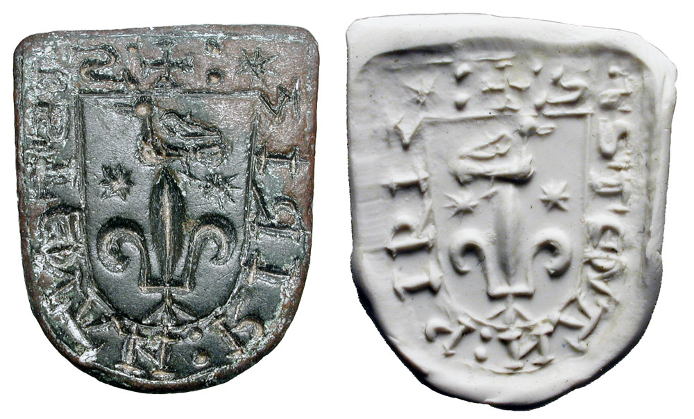 Bronze Seal Matrix. Spain, XIII-XIV Century AD. Seal of Estefan Perez (S ESTEIVAN PIRIZ), shield of arms (Bird over large Lis, stars to sides) in shield-shaped seal. 1? long with looped handle. Intact. and Choice. Rare armorial item.