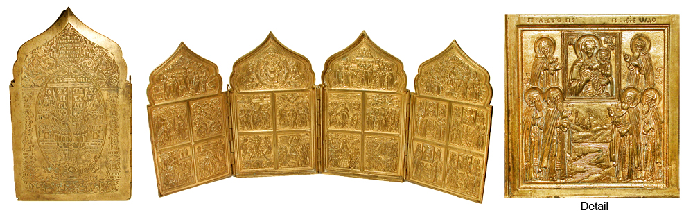 Gilded Brass Icon. Russia, c 1775-1825 AD. Gilded cast brass icon of four panels each with five biblical scenes with engraved details and inscriptions. Each panel 7? x 4.25? (16.5? open). c.f. Knuz collection 25819.055. Superb. The scenes represented are as follows:Cover: Patriarchial Cross with tutulum and foot-rest; lance and sponge all before city wall. Russian TextPanel 1: Crest: The Crucifixion of Christ1. The Annunciation2. The Nativity of Christ3. The Entrance of Mary into the Temple4. The Birth of the Mother of GodPanel 2:Crest: The New Testament Trinity1. The Meeting in the Temple2. The Baptism of Jesus3. The Entrance into Jerusalem4. The Transfiguration of JesusPanel 3:Crest: Exaltation of the Cross (Ss Mary & Constaintine)1. The Resurrection2. The Ascension3. Dormition of the Mother of God4. The Old Testament TrinityPanel 4:Crest: The Praise of the Mother of God1. The Tikhvin Mother of God (Ss Alexander & Cyril)2. The Vladmir Mother of God (Ss Maxim & Leonty)3. Mother of God of the Sign (Ss Anthony & Leioty)4. Smolensk Mother of God (Ss Anthony & Theodosius)